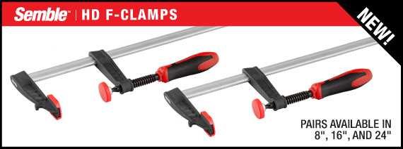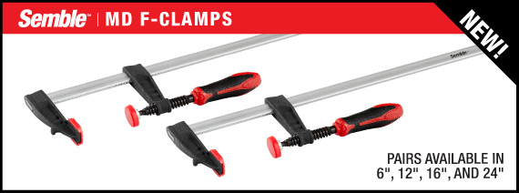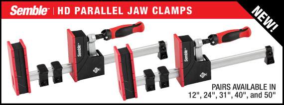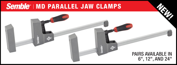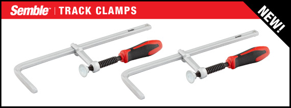 Anyone who says, “A clamp is a clamp, they’re all the same” doesn’t spend enough time in their shop. It doesn’t take long for the cost-cutting differences found in many clamps to turn normal, mild-mannered woodworkers into oath-spewing lunatics. When you’re ready for clamps where the subtle differences are actually improvements that make your life easier, you’re ready for our new Semble clamps. The bars on Semble clamps have been surface-treated and zinc plated for smooth operation, and corrosion resistance. The dual-durometer molded handles deliver a comfortable, non-slip grip. And, the parallel jaw and F-clamps have a patented Anti-Slip System that prevents the sliding jaw from moving until you want it moved. Altogether, these and other features unique to each design make Semble clamps a joy to use in your shop. Woodpeckers is the exclusive North American distributor for Semble clamps. As an introductory special we’re offering 5 different styles, 4 of which are available in a range of sizes. There’s the handy Track Clamp, medium-duty and heavy-duty “F” Clamps and light-duty and heavy-duty Parallel Jaw Clamps. The links below (above) will take you to pages on each of the clamp styles with full details about the available sizes. When you’re ready for better clamps, reach for Semble. |